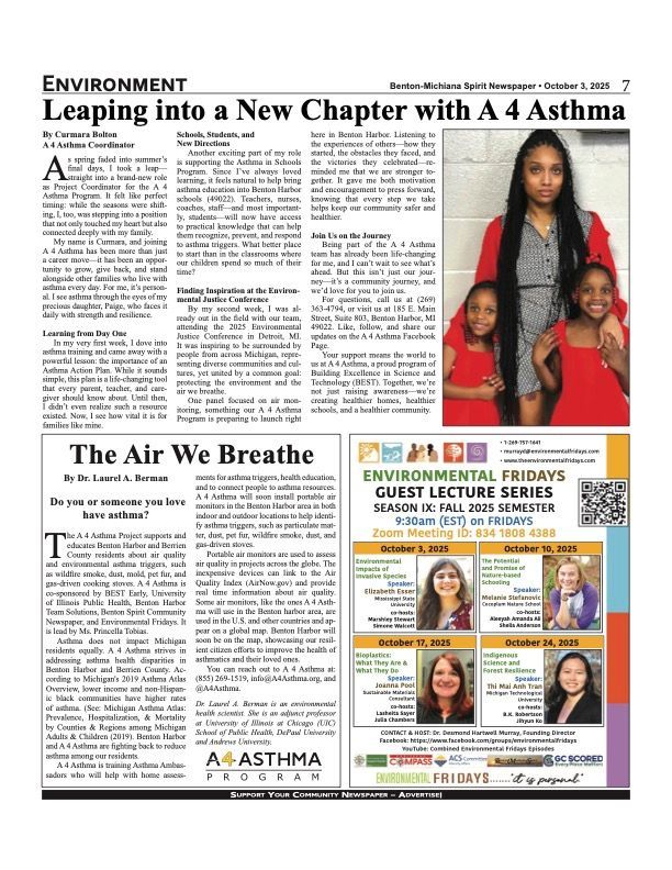 Benton Spirit, consistent with the BEST Early philosophy and mission, also provides opportunities for young people to work and learn to become journalists. It does so by engaging local Benton Harbor youth in early participation programs such as, Aspiring Young Journalists, Generation X, Journaling Our Future, and Taking it to the Streets. This involves them researching, interviewing, photographing, and writing.