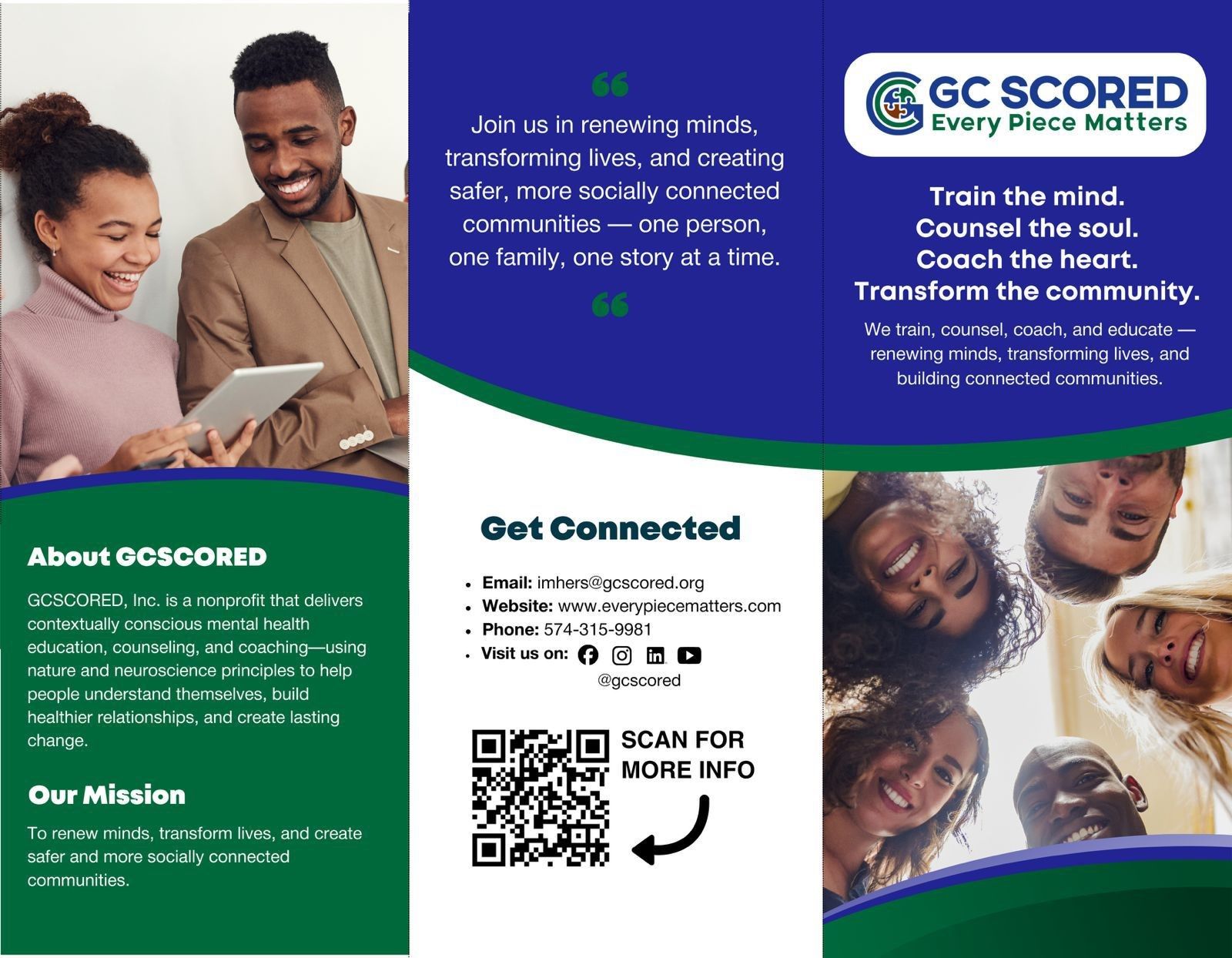 GCSCORED delivers contextually conscious and inclusive mental health education, counseling, coaching, and wellness services designed to strengthen relationship-cultivation competencies, foster healthier connections, and equip individuals, families, and organizations with the tools to build resilience and thriving communities through transformative training, support, and care.