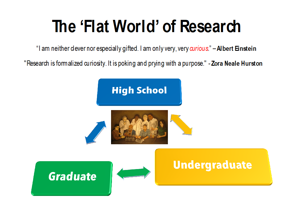Both high school and college researchers were focused on and trained to utilize modern synthetic organic chemistry lab techniques, including FTIR and NMR. Eventually, the Grade 12 experience developed into a year-long interdisciplinary course with Fall focused on organic synthesis and Spring generally focused on bioactivity (e.g. anticancer, antibacterial, anti-fungal, pesticidal) of the synthesized compounds. However, some projects such as, investigating ‘green’ non-polluting synthetic processes and development of new organic reactions, extended for the entire school year. Several of these undergraduate and high school projects provided the basis for graduate level research projects and dissertations. This helped us to create a synergistic inter-level research ecosystem as illustrated below.